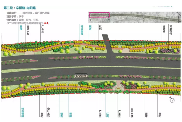 第三段为辛桥路——向阳路段,将实施噪音隔离,打造城区绿色屏障的铁路防护网,以常绿高大乔木作为背景,配以色叶植物,打造深秋初冬彩叶斑斓的景观;乔灌草搭配,形成层次丰富的组团,对铁路、高架起遮挡作用;局部阵列大乔木,营造规则大气的景观效果。
